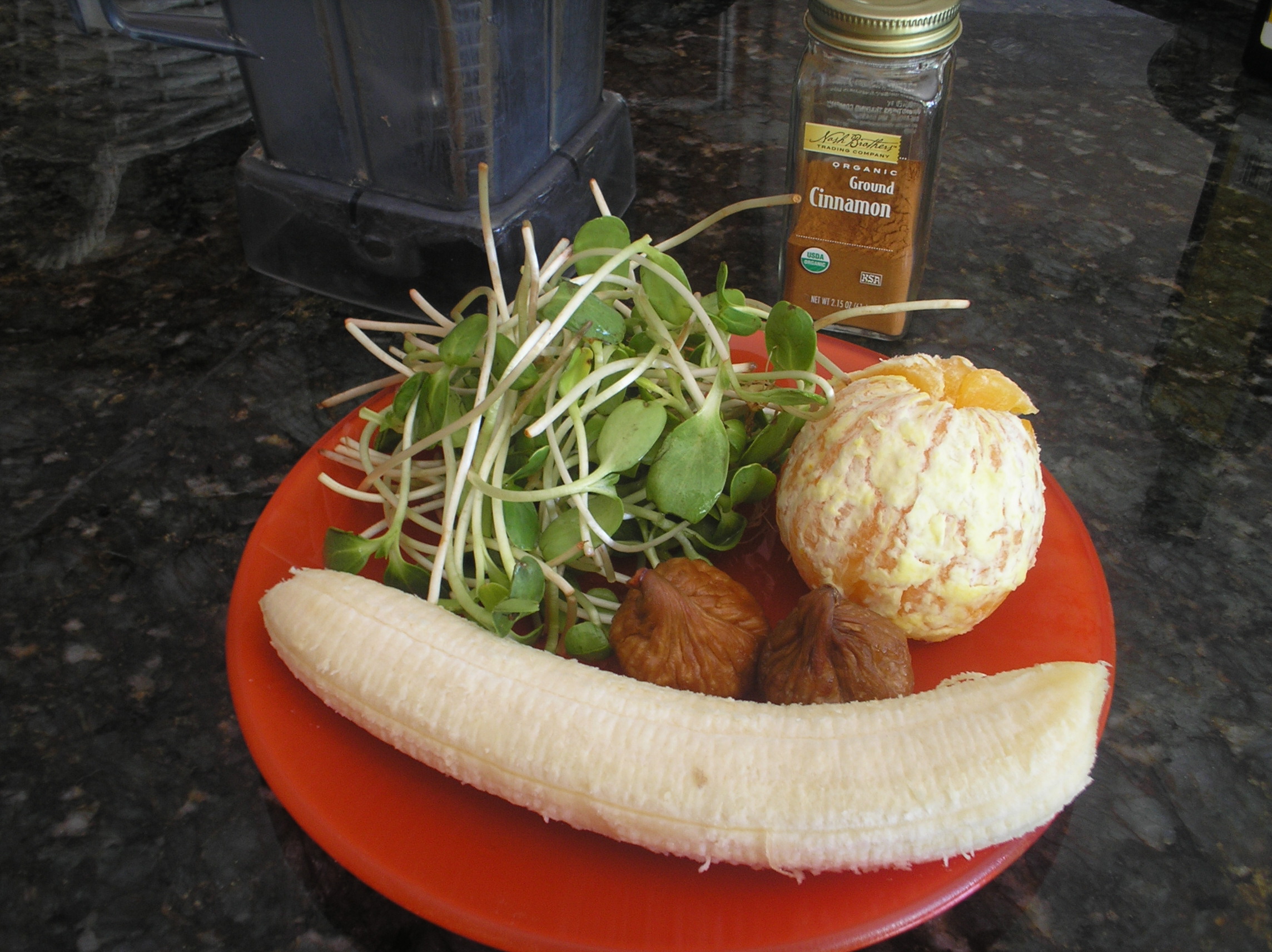 I love to make these when I have all the ingredients on hand: banana, sunflower sprouts, orange, dried figs and cinnamon.