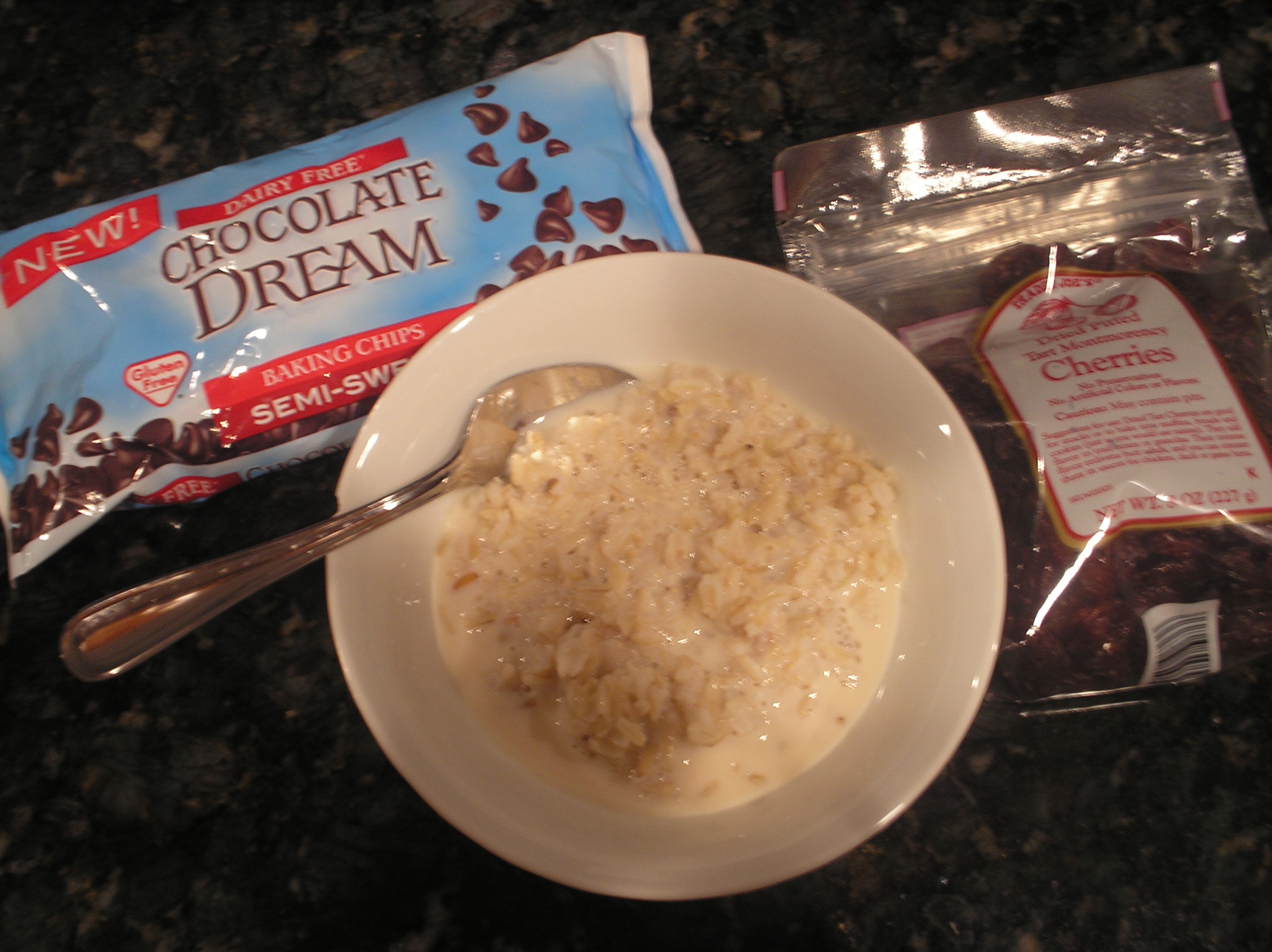 Cooked rice, soy milk, dried tart cherries and a few chocolate chips, nothing easier than this!