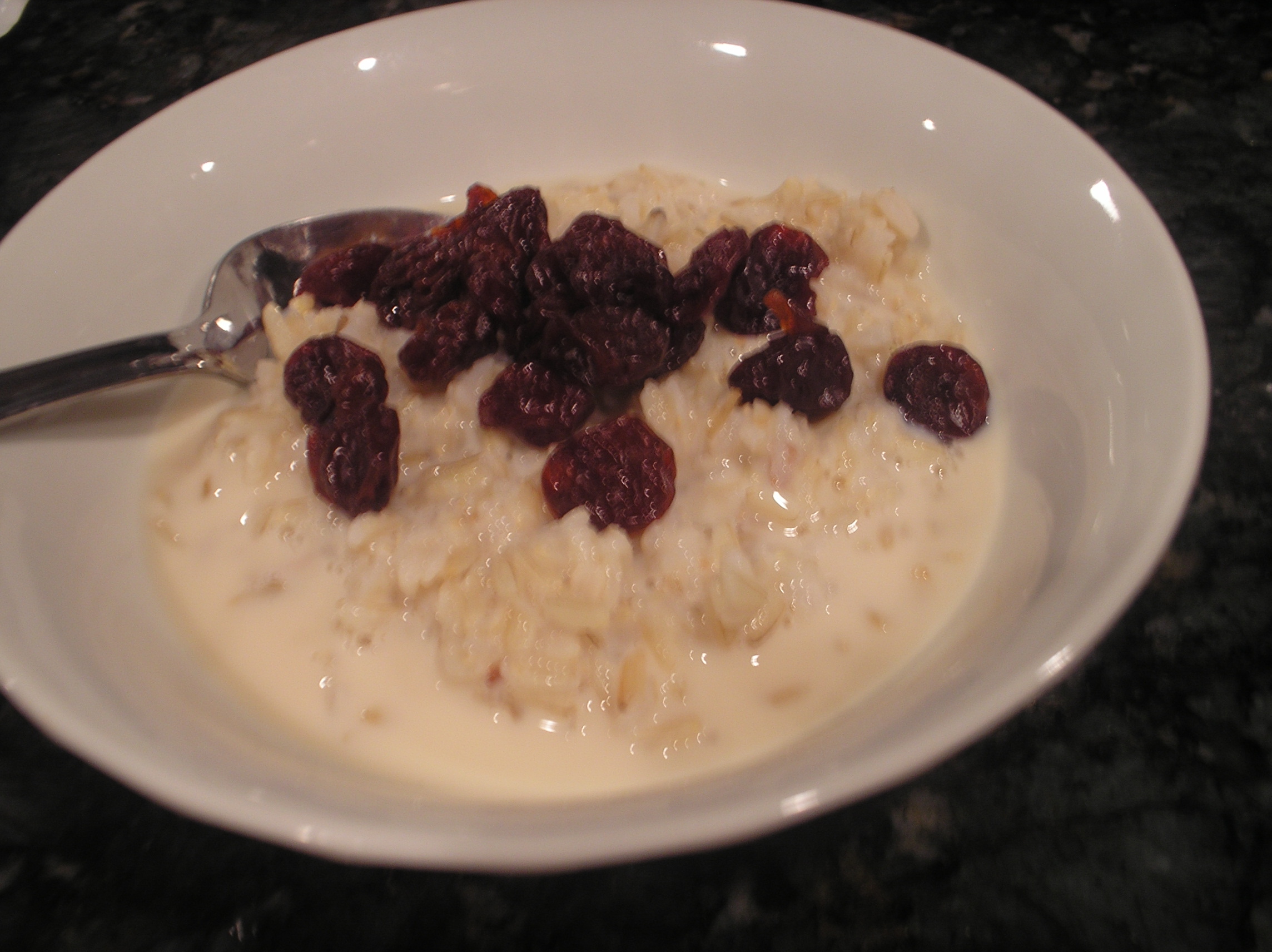 Put the rice, some soy milk and a few dried cherries in a bowl, and microwave for about a minute.