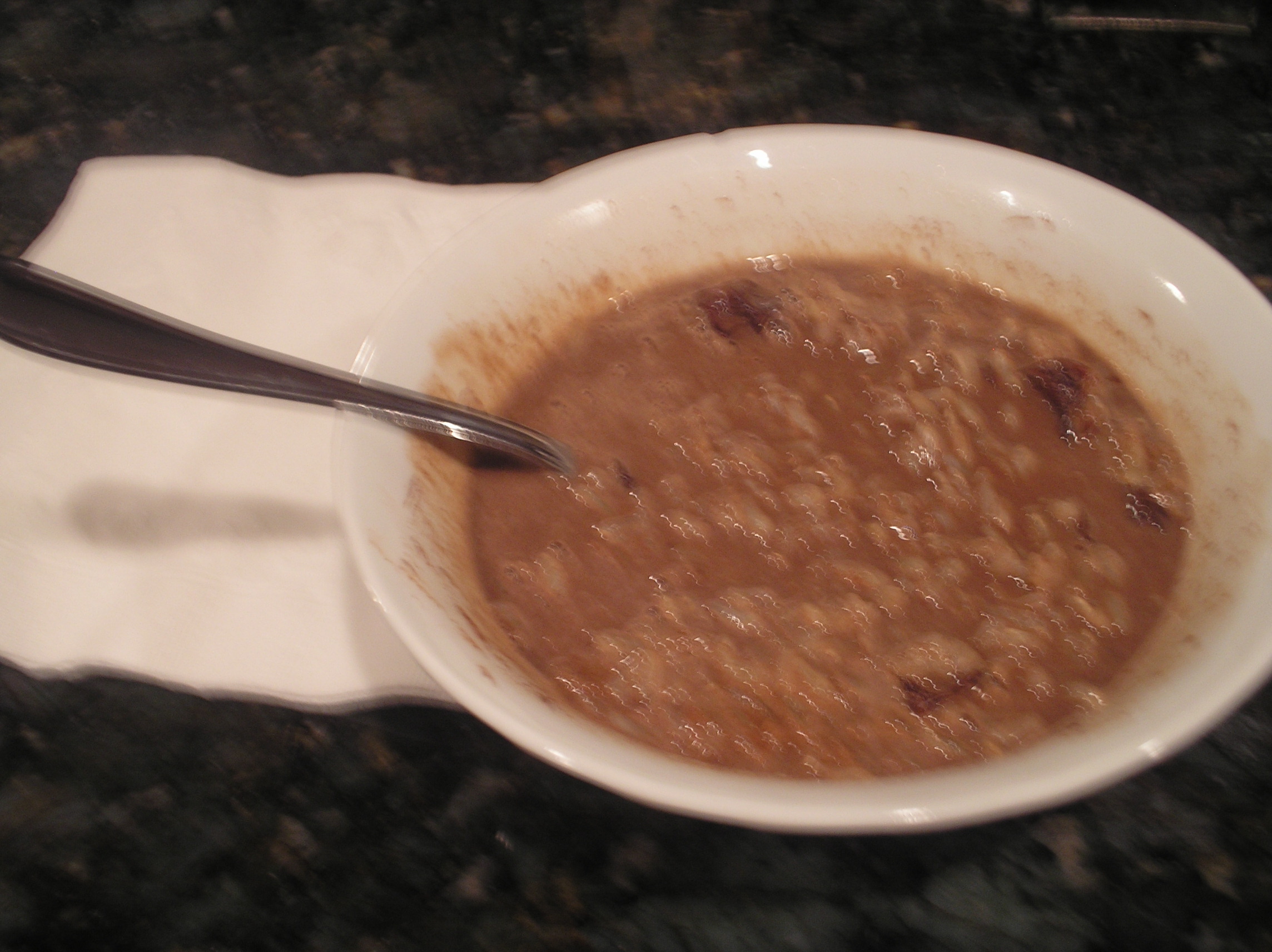 Sprinkle a few chocolate chips on top and mix together. I’d used a little too much soy milk, so it was like hot chocolate in a bowl with a few mix-ins, but it tasted fabulous ~ much better than it looked!