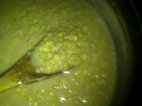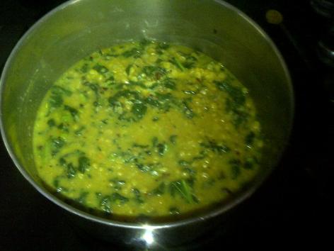 I started by cooking 2 cups of dal in 4 cups of water. I used about half red lentils and, when I ran out of that, half channa dal. I cooked it for about 30 minutes. At that time, the red lentils had turned into mush, and the channa dal was soft but still pretty al dente. I let it sit, figuring that it would cook more when the rest of the ingredients were added.
