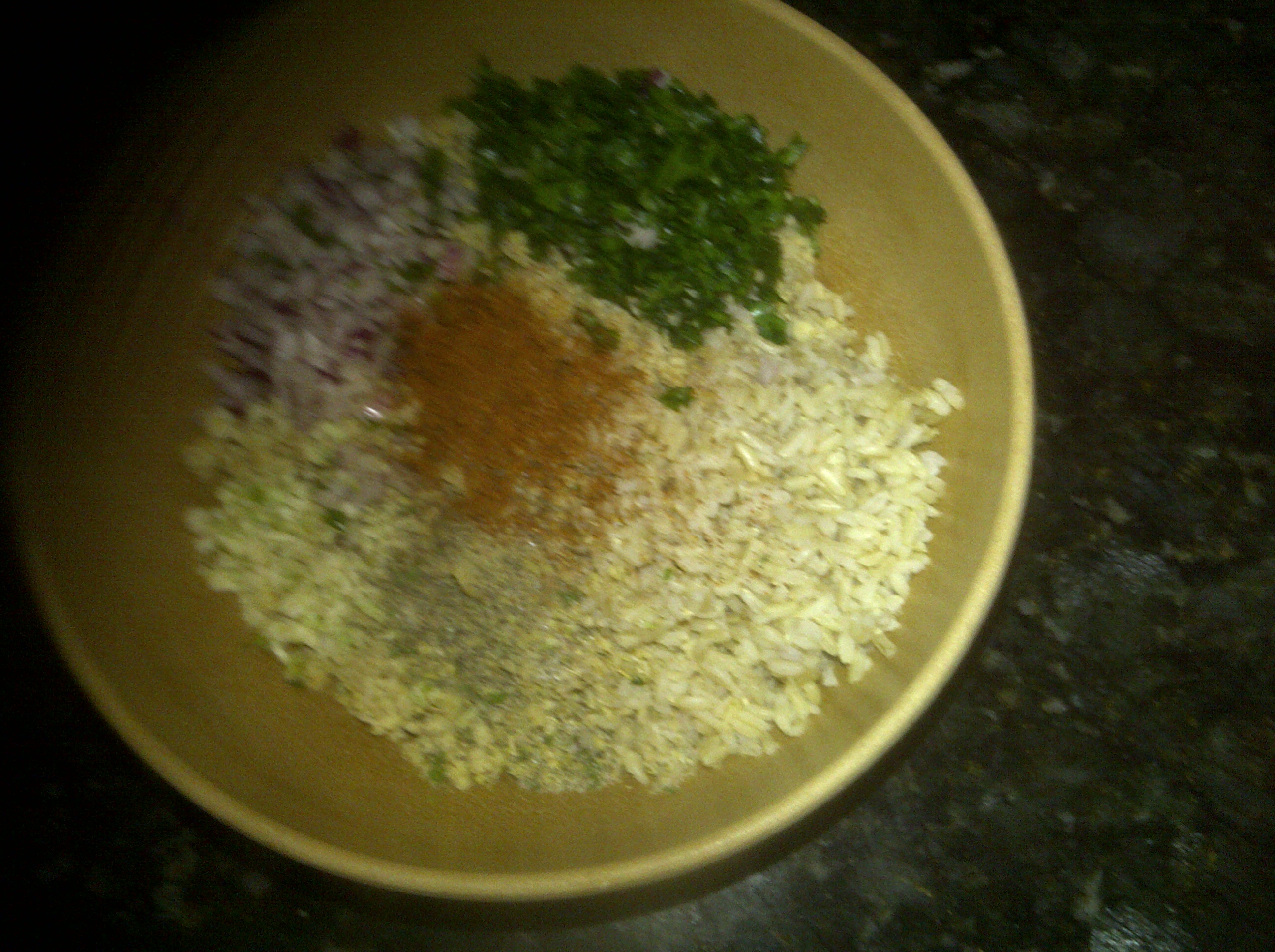 It was a very simple combination of ingredients – 2 packages of tempeh, 3 cloves of garlic (minced), 1/4 cup minced red onion, 1/4 cup chopped parsley, 1/2 teaspoon salt, 1/2 teaspoon black pepper, 1/2 teaspoon dried oregano, egg replacer for 1 egg, and about 1/2 teaspoon of smoked paprika.