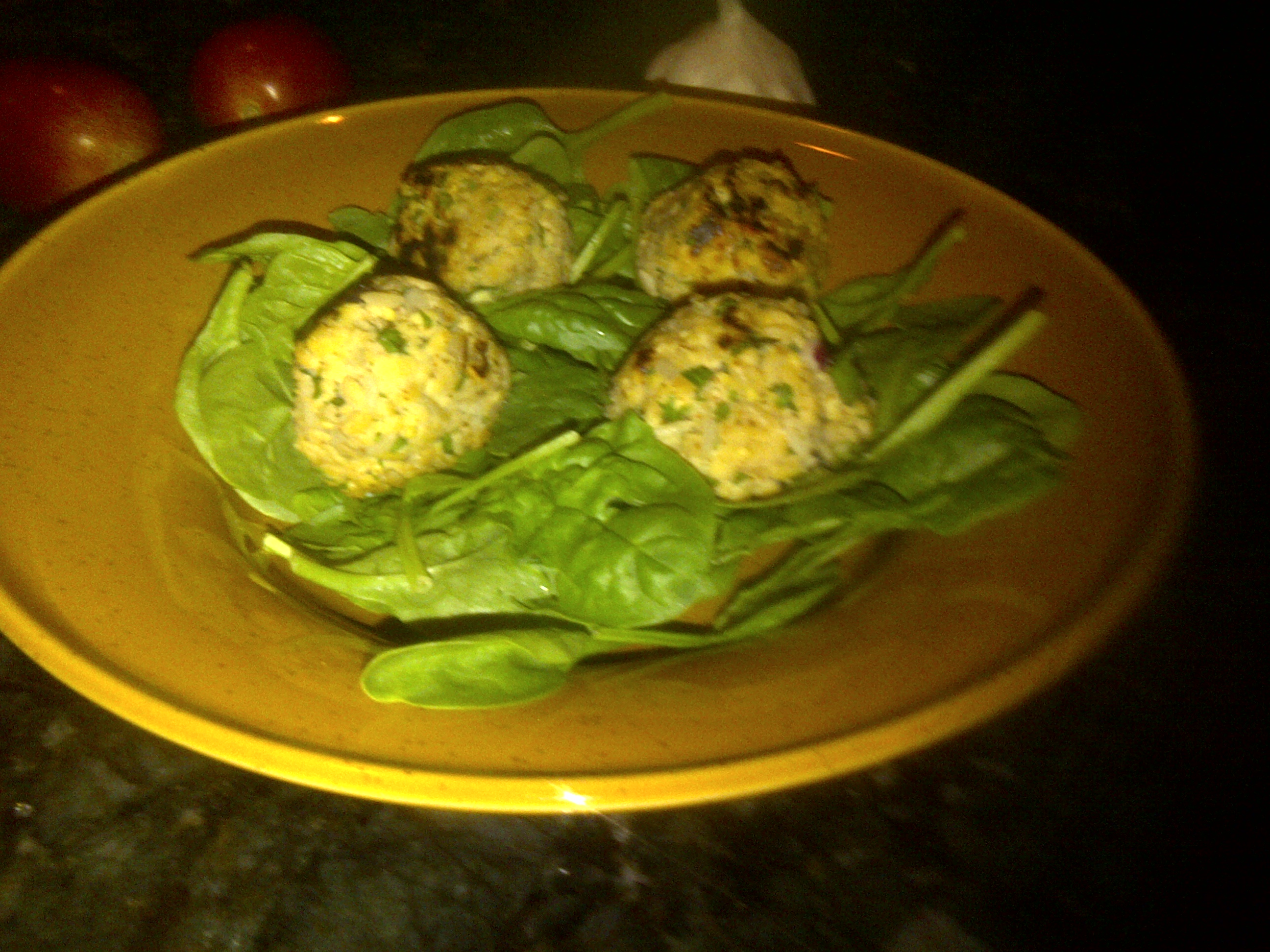 Once mixed together, form the shape you want. I made little spherical shapes this time. I sprayed the pan lightly with grapeseed oil spray, and then browned the tempeh in the pan. It took about 10 minutes total, a few minutes on each side.
