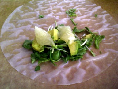Prior to rolling…. I chopped the arugula and sunflower sprouts for ease in eating. There’s nothing worse than biting into a spring roll and losing half of the inside because it’s too hard to bite off. I added several pieces of avocado, then went pretty light on the grapefruit since I didn’t know how it was going to taste – I only added 2 grapefruit sections to each roll, but in the future I’d probably add one or two more.