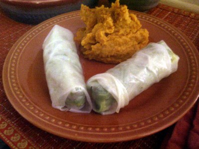 Then once rolled, they went nicely with some coconut mashed yams and salad. The salad had tahini dressing, which was also used as the dipping sauce for the spring rolls. They had a really nice flavor that will definitely be replicated, and were a nice change from the Asian-inspired spring rolls that I usually make.