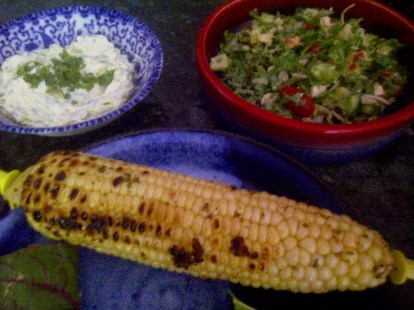 This week has definitely been made for grilling. Lots of raw foods, but the little bit of cooking that I did needed to be outside of the house. And corn on the cob is one of those things that I try to do often during the summer, especially when it can be grilled. To add a little bit of zip to it today, I added the bright flavors of cilantro and lime.