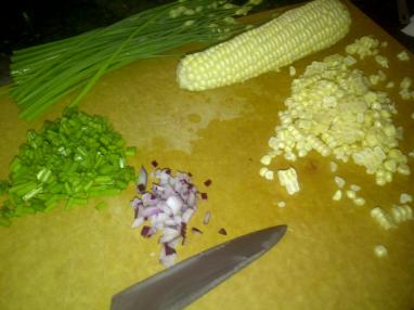 Once blended, stir in the kernels from 1 ear of corn.  Garnish with minced garlic chives & dehydrated (or fresh) jalapeno pepper.