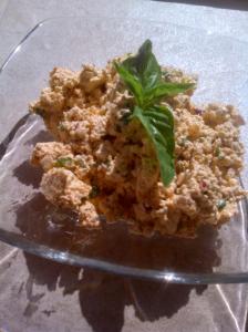 I had some of the tofu salad initially on lettuce leaves, then I started eating it right from the dish :-). And the best part of this whole recipe? When I ate some of it alone, it had a flavor and consistency remarkably like cottage cheese! I would LOVE to have a vegan cottage cheese recipe, so I will be experimenting to make this more like that…… results to come!