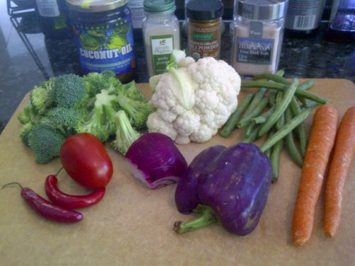 The veggies: broccoli, cauliflower, green beans, carrots, purple bell pepper, red onion, tomato and fresh red chiles