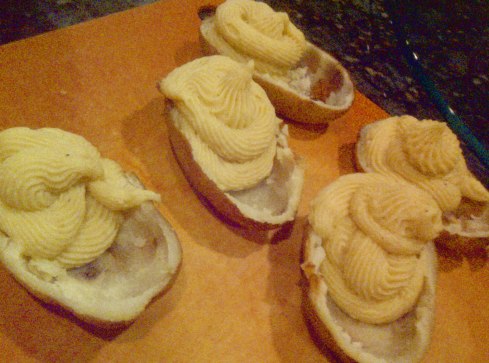 Once the potatoes are filled to your liking, they are ready to be baked again. Heat in the oven at 300 degrees until warmed through. You can also put them under the broiler for a few minutes at the end….