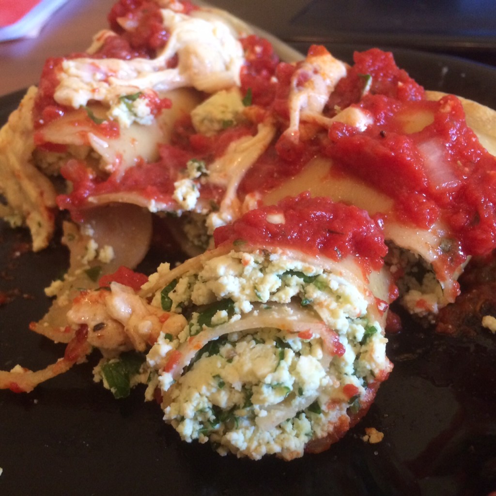 When ready to make the rolls, spread a thin layer of marinara on the bottom of a 10×13 baking dish. Spread a thin layer of the filling down the length of each noodle and roll up. If the filling is too thick it will be difficult to roll. Place the rolls in the baking dish, then cover all of them with the remaining marinara and sprinkle with the vegan mozzarella.
