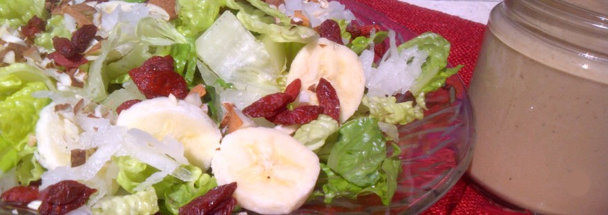 Salads in our house are typically the a-little-of-everything, chopped up and served with a nice tahini dressing or balsamic viniagrette sort. These are wonderful, and incredible sources of nutrition, but every so often I want a salad with more focused flavors. One of my favorites is Kristen's Banana Romaine salad with ginger shallot dressing. I… Continue reading Banana Romaine Salad – My Tweaked Version